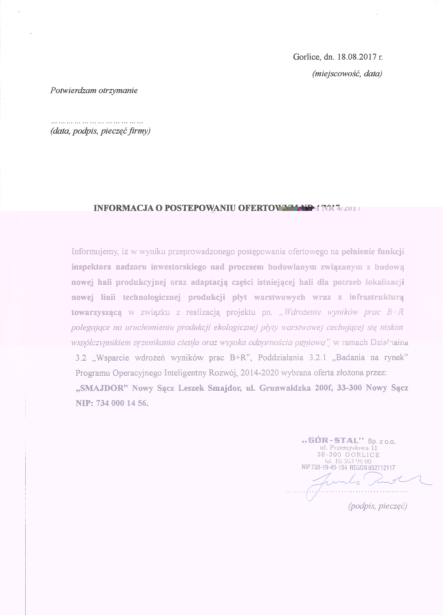 Request for Quotation No. 6/2017 for manufacturing a complete new process line for the production of wall sandwich panels in steel skin sheets with a PIR core and mineral wool elements together with transport and installation.